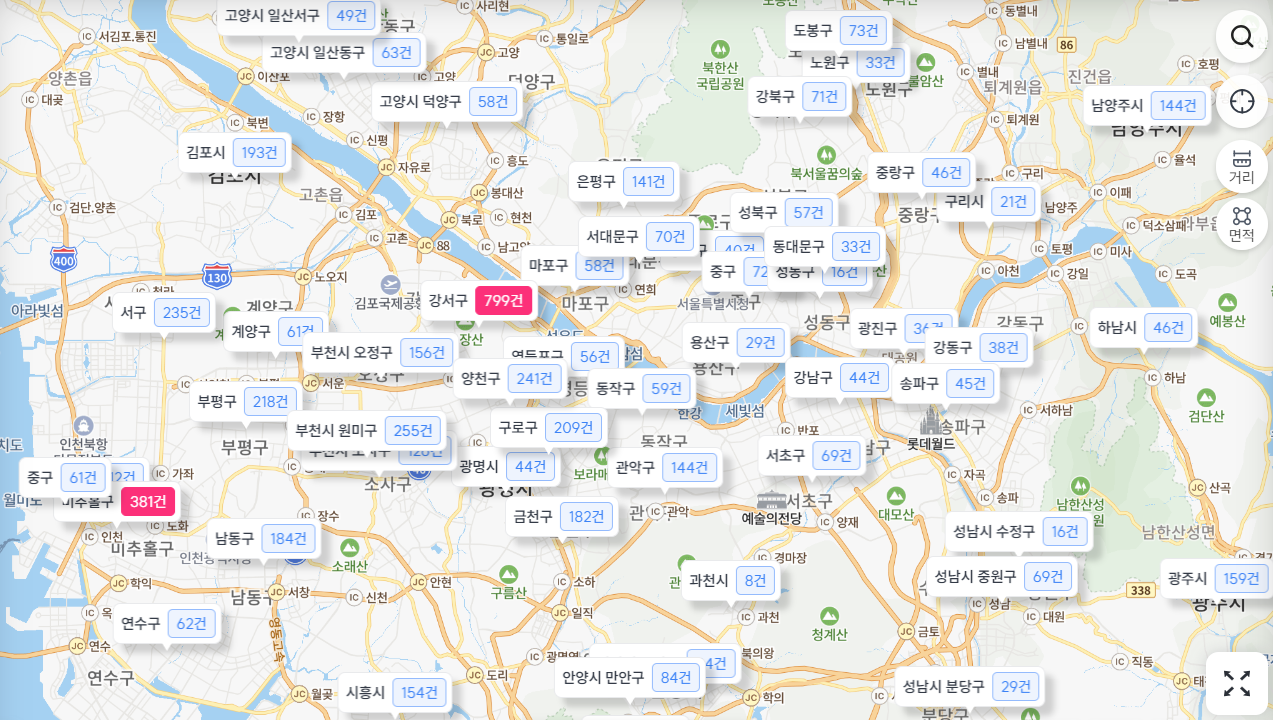 첫번째 지도는 강서구 화곡동의 경매 건수를 나타내는 지도 입니다.