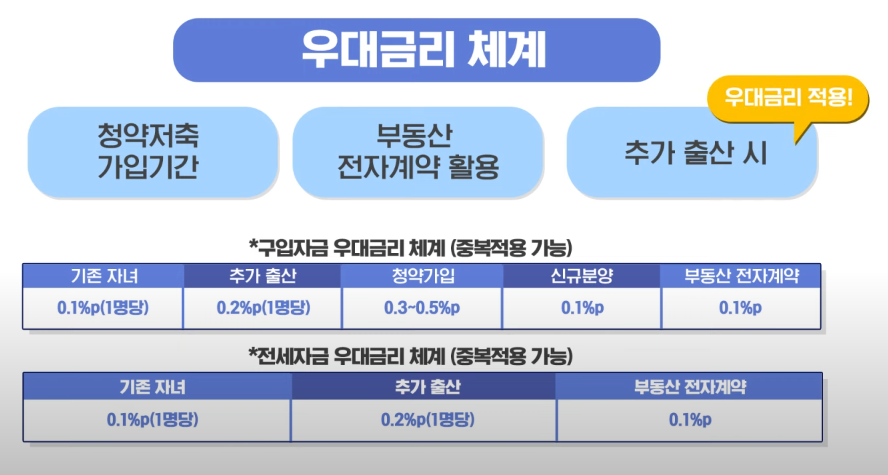 - 출산 우대: 대출접수일 기준 2년 내 추가 출산한 자녀 1명당 0.2%포인트, 출생 후 2년 초과한 미성년 자녀 1명당 0.1%포인트 우대.