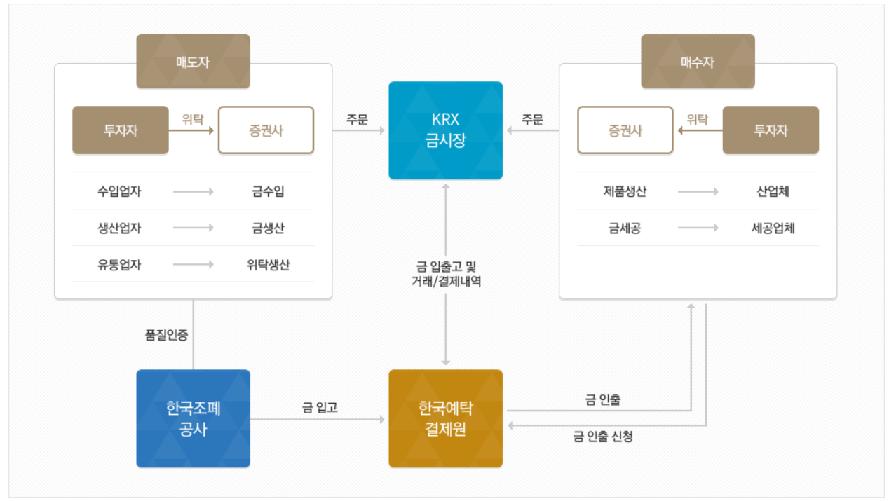 - KRX 한국거래소: KRX 금시장은 한국거래소가 금융위원회의 승인을 받아 2014년 3월 24일에 설립하고 운영하는 금 현물시장입니다. 이 시장은 주식 거래와 유사하게 13개 증권사를 통해 계좌를 개설하고, 증권사의 거래 시스템을 통해 투자자가 직접 금을 거래할 수 있도록 설계되었습니다. 해당 증권사에는 KB증권, NH투자증권 등이 포함됩니다. 이 외의 모든 금 거래 방식(예: 홈페이지를 통한 거래, 리딩방 거래, 장외 실물거래 등)은 KRX 금시장과 관련이 없습니다.