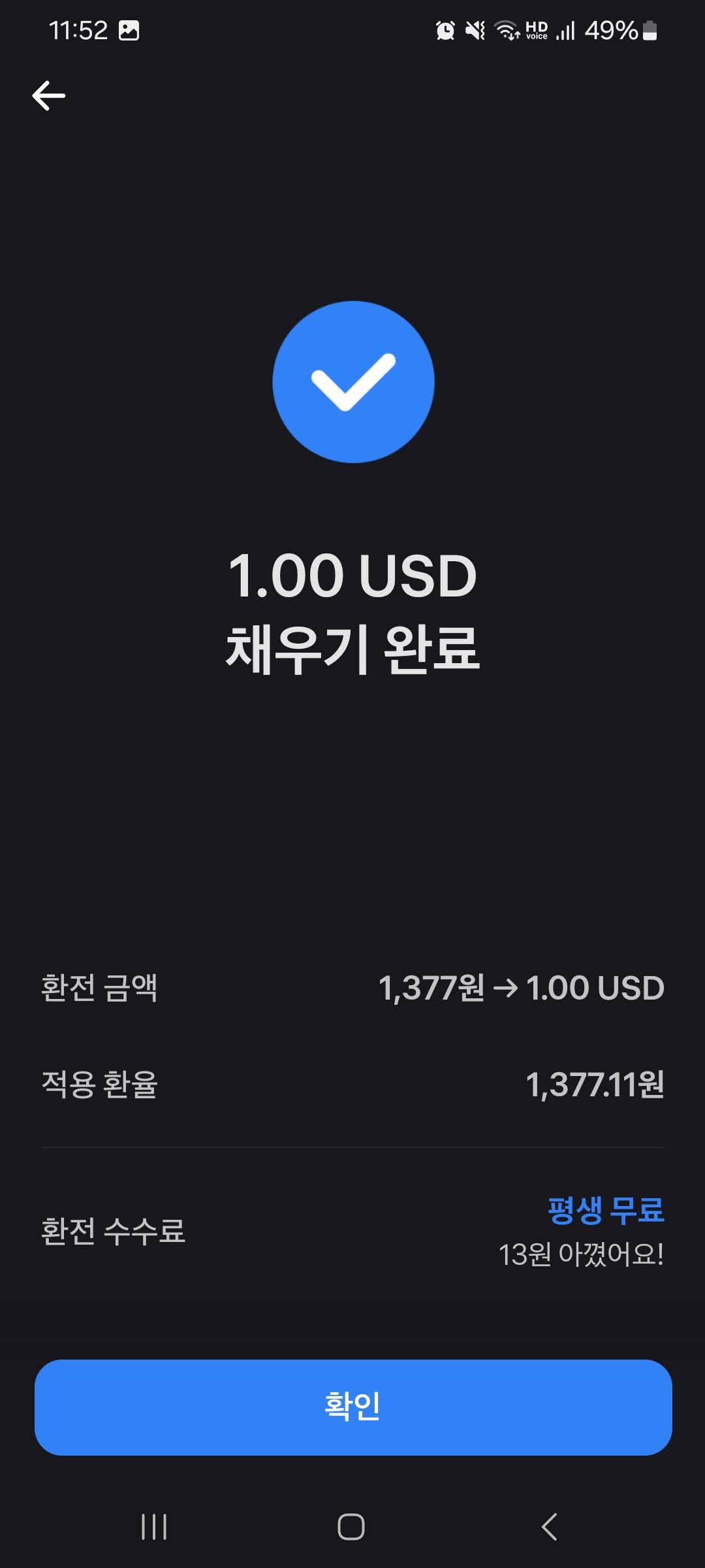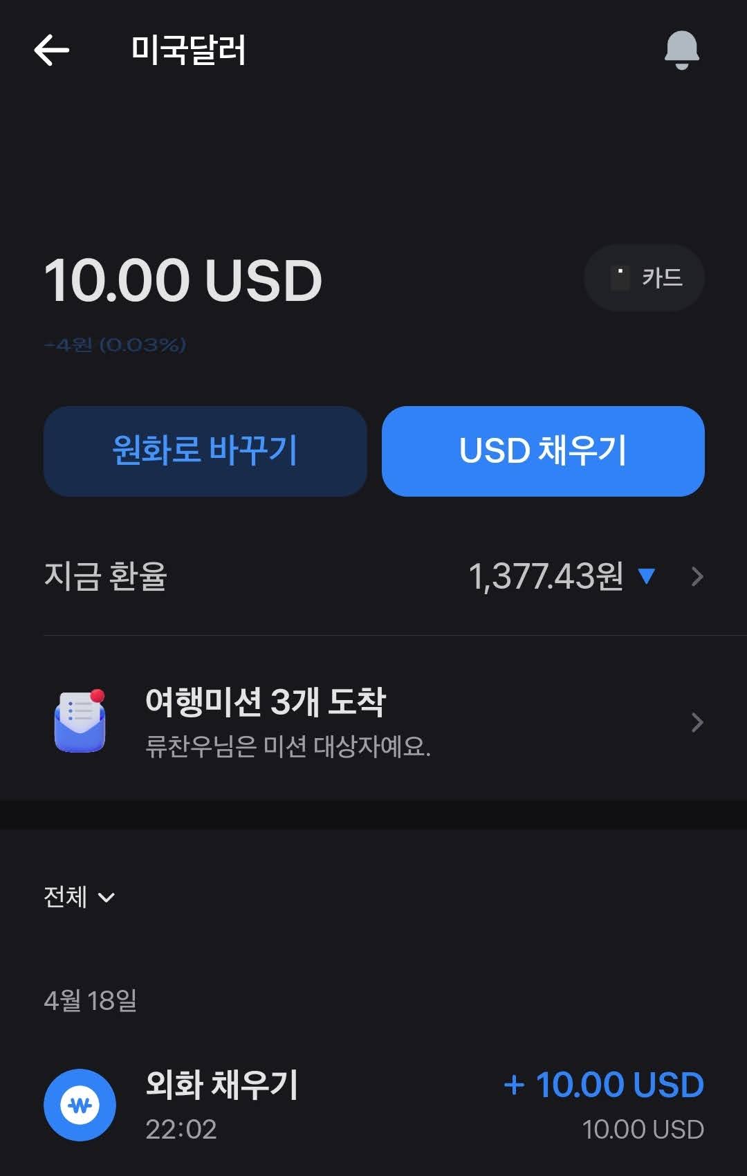 환전하고자 하는 외화를 선택하고 USD채우기를 누르면 너무나 간단하게 현재 환율인 1377원에 1달러가 환전됩니다.