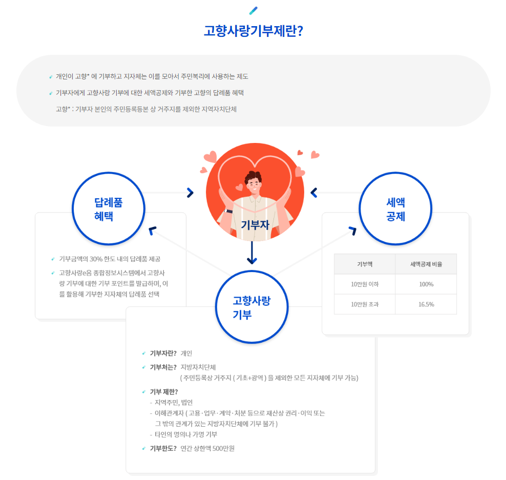 고향사랑기부제는 국민들이 자신의 고향 또는 마음에 드는 지역에 기부를 할 수 있는 제도입니다. 이 제도를 통해 기부자는 자신이 선택한 지역의 발전을 직접 지원할 수 있으며, 기부금은 해당 지역의 다양한 지역 개발 프로젝트에 사용됩니다.