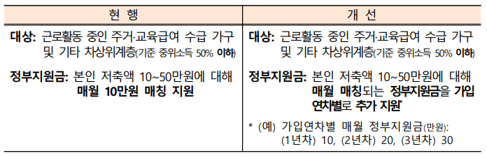 희망저축계좌Ⅱ의 정부지원금을 인상하여, 근로를 통한 자립기반 형성을 적극 지원합니다. 예를 들어, 가입 연차별로 차등 지원하며 1년차에는 10만 원, 2년차에는 20만 원, 3년차에는 30만 원을 지원합니다.