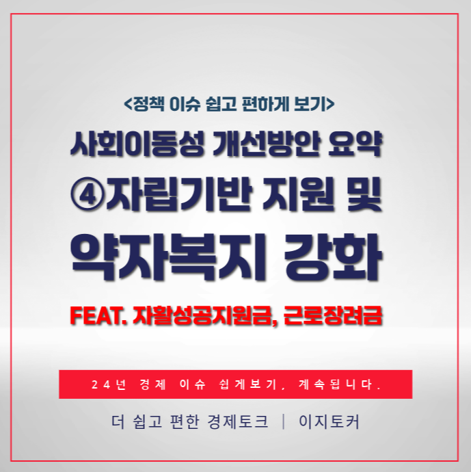 새로운 정책으로 자립과 복지가 한층 강화됩니다! 자활성공지원금으로 민간 취업 후 최대 150만 원을 지원받으세요. 근로의욕을 높이기 위해 EITC와 실업급여가 개편되며, 생계급여의 기준이 상향 조정됩니다. 자산형성부터 생활 보장까지, 더 나은 내일을 위한 변화가 시작됩니다.