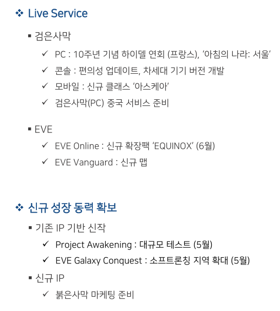 - EVE IP 확장: 'EVE'는 지속적인 성장세를 보이며, 향후 'EVE 뱅가드'와 같은 새로운 FPS 게임의 테스트를 지속하며 유저 기반을 확대할 계획입니다.