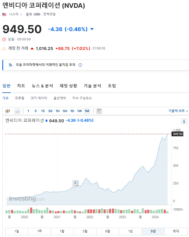 엔비디아는 또한 10대 1의 주식 분할을 발표했습니다. 이번 주식 분할은 2021년 이후 3년 만에 이루어지는 것으로, 주가는 시간외 거래에서 7% 가까이 급등하며 1천 달러를 넘어섰습니다. 분할 후 주가는 약 94.95달러로 조정되어, 소액 투자자들도 쉽게 접근할 수 있게 되었습니다. 이는 주식 수요 저변을 확대하는 긍정적인 효과를 기대할 수 있습니다.