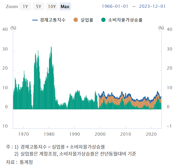 - 인플레이션과 실업률의 합산: 경제고통지수는 물가상승률(인플레이션)과 실업률을 더한 값으로, 이 두 지표가 동시에 상승하면 경제 고통이 커짐을 의미합니다.