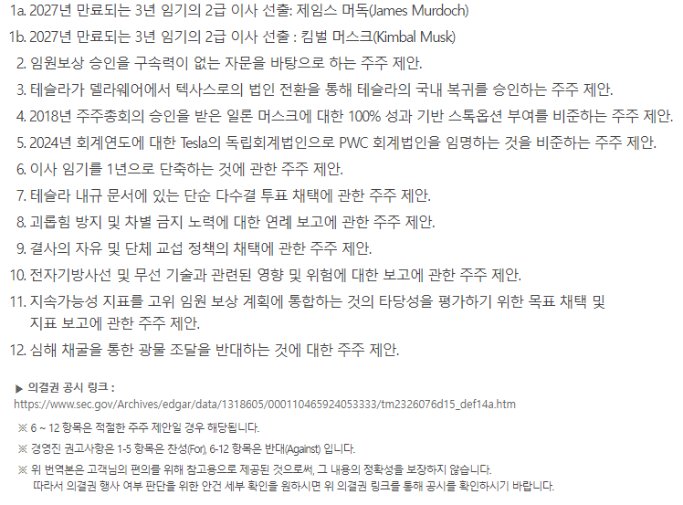 (참고로 1번~5번은 찬성, 6번~12번 반대 하시면 됩니다. 전 신한투자증권 해외주식팀에 직접 전화해서 의결권 행사했습니다. 유선으로만 가능하다고 합니다. 증권사별로 다르니 꼭 확인해보세요. 테슬라를 지키고 일론 머스크를 지켜야합니다.)