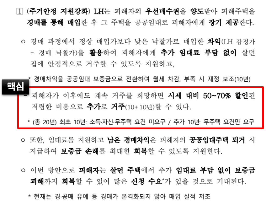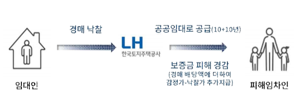 LH(한국토지주택공사)는 피해자들이 살던 주택을 경매를 통해 매입하고, 이를 공공임대로 제공하여 피해자들이 장기간 안정적으로 거주할 수 있도록 지원하고자 하고 있습니다.