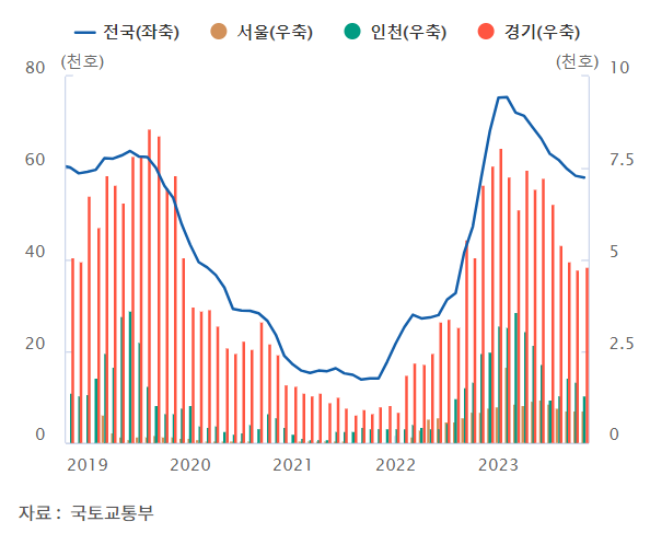 - 양축 설명: 왼쪽 세로축(단위: 천호)은 전국의 미분양주택 수를 나타내고, 오른쪽 세로축(단위: 천호)은 수도권의 미분양주택 수를 나타냅니다. 가로축은 2019년부터 2023년까지의 시간을 나타냅니다.