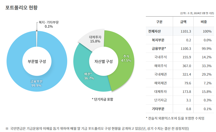 이를 통해 국민연금은 기대수익률이 높은 주식과 대체투자 비중을 늘리고, 상대적으로 안정적인 채권 비중을 줄이는 전략을 취하고 있습니다.