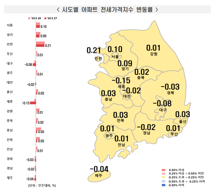 - 경기: 0.09% 상승, 광명시(0.31%), 수원 영통구(0.23%) 등이 상승했습니다.