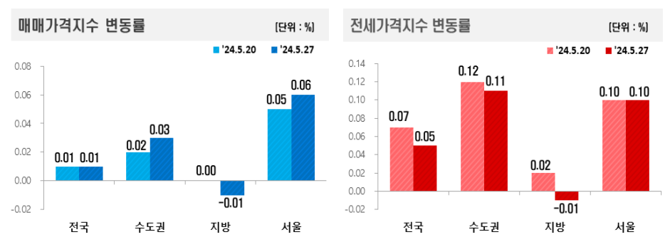 수도권의 매매가격은 0.03% 상승했으며, 특히 서울은 0.06% 상승했습니다. 서울의 경우, 주요 관심 단지를 중심으로 매수 문의가 꾸준히 유지되면서 저가 매물이 소진된 후 일부 상승 거래가 발생했습니다.