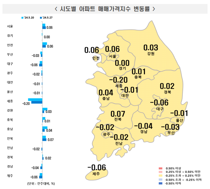 - 인천: 0.06% 상승, 중구(0.19%), 서구(0.07%) 등이 상승을 주도했습니다.