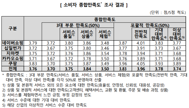 - 종합 만족도에서는 쿠팡이 3.83점으로 가장 높았으며, 네이버 쇼핑(3.79점)이 그 뒤를 이었습니다.