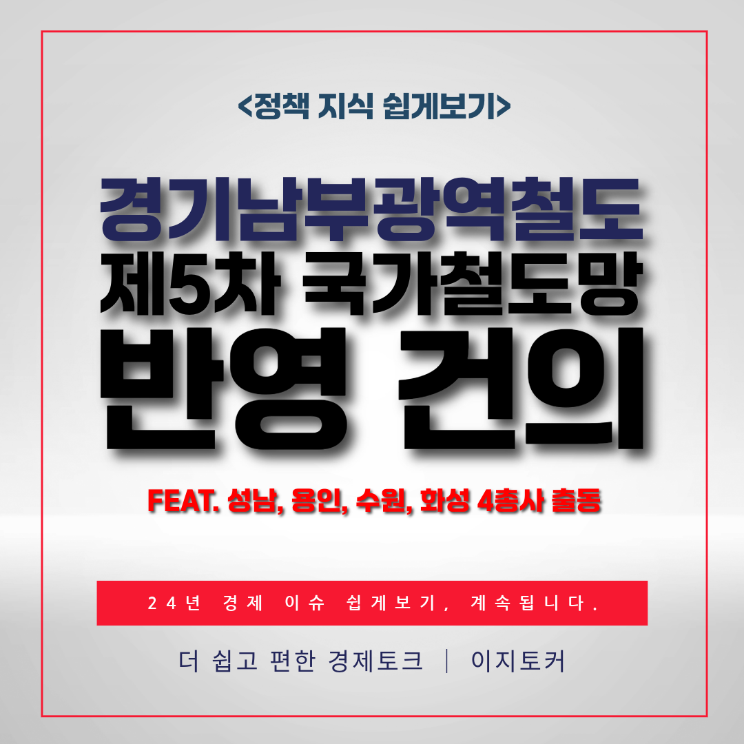 수원, 용인, 화성, 성남시가 공동으로 추진 중인 ‘경기남부광역철도’ 사업의 운명이 내년 7월경 결정될 전망이다. 이 사업은 현재 국토교통부에 ‘제5차 국가철도망 구축계획’의 신규사업으로 건의된 상태로, 내년 4월 공청회를 거쳐 최종 고시될 예정이다.