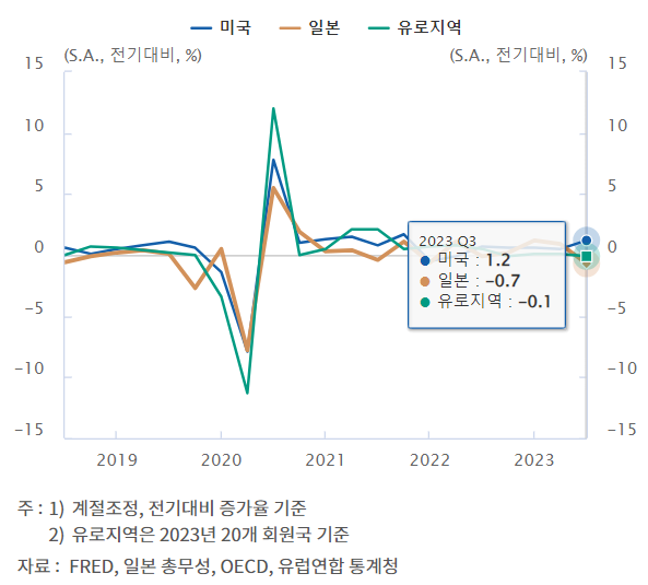 일단 주요 선진국 경제성장률을 봤습니다. 일본은 2023년 3분기 결국 -0.7% 역성장을 기록하고 미국은 +1.2% 성장했습니다. 역성장은 매우 상징적인 의미로 금융, 통화 정책 기조에 큰 방향전환의 지침이 될 수 있다고 생각합니다.