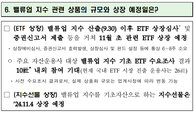 한국거래소는 밸류업 지수를 기반으로 다양한 투자 상품을 개발할 예정입니다. 2024년 11월에는 밸류업 지수를 추종하는 상장지수펀드(ETF)와 지수선물이 상장될 계획입니다. 이로 인해 기관 투자자들의 투자 유도가 기대되며, 한국 증시의 재평가에도 긍정적인 영향을 미칠 것으로 보입니다.