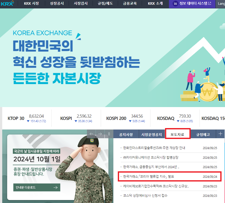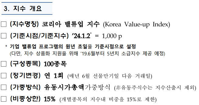 한국거래소는 2024년 9월 24일, '코리아 밸류업 지수(Korea Value-up Index)'를 발표했습니다. 이 지수는 한국 기업 중 주주환원율, 자본효율성(ROE), PBR(주가순자산비율) 등 다양한 질적 지표를 충족하는 상장기업 100개로 구성되었습니다. 이는 정부의 기업 가치 제고 지원 방안의 일환으로 개발되었으며, 투자 유도를 목표로 하고 있습니다.