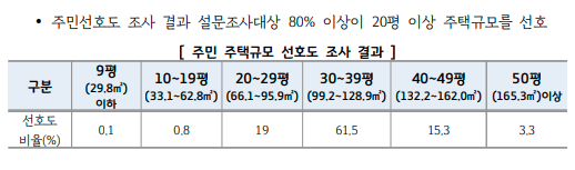기존 일산 신도시의 인구는 약 24만 명이지만, 이번 계획에 따라 약 6만 명이 추가로 유입될 것으로 예상됩니다. 계획 인구는 30만 2,622명으로 설정되었으며, 세대 수는 131,575세대로 증가할 것입니다. 아래 보면 주민 주택규모 선호도 조사 결과에 따르면 30~39평이 61.5%로 압도적이네요. 국평, 국평 하는데에는 이유가 있는 것 같습니다.