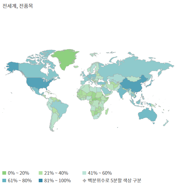 나라별 백분위수를 5분할하여 색깔의 농도로 표시한 지도입니다.