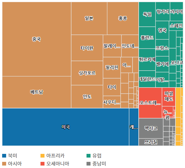 한눈에 보기 쉽죠. 동유럽으로의 수출은 생각보다 크지 않네요.