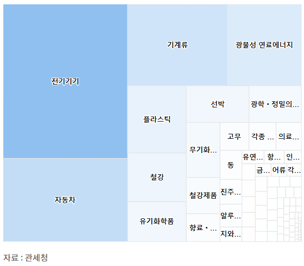 전자기기, 자동차, 기계류, 광물성연료에너지