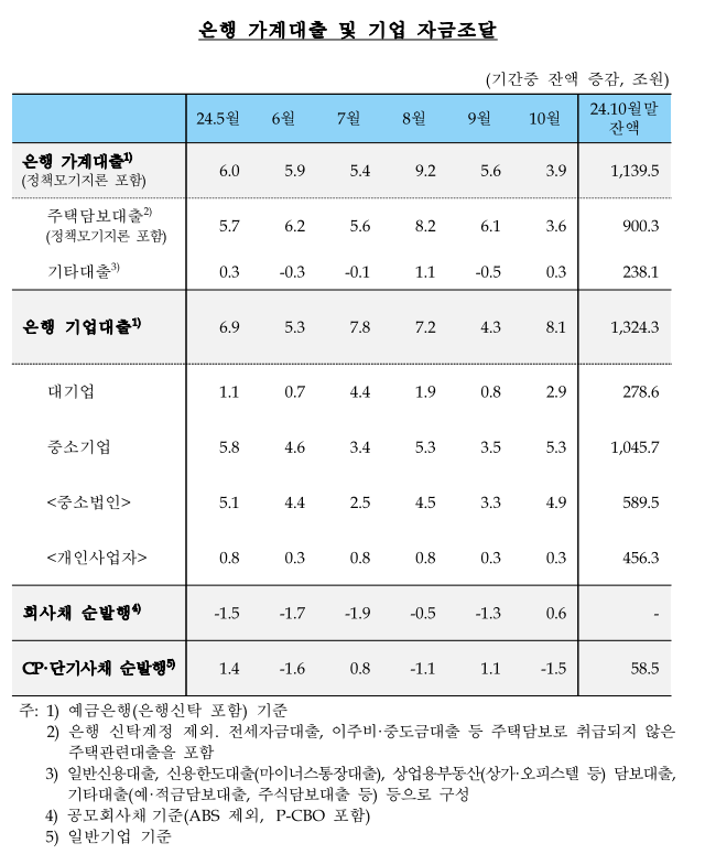 - 기업대출 증가폭 확대: 10월 기업대출은 9월 대비 3.8조 원 증가한 +8.1조 원으로 나타났으며, 대기업과 중소기업 모두 자금 수요가 증가했습니다.