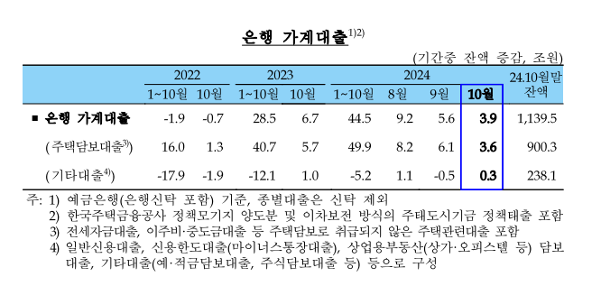 - 가계대출 증가폭 축소: 10월 은행권 가계대출은 9월 대비 1.7조 원 줄어든 +3.9조 원 증가를 기록했습니다. 특히, 주택담보대출 증가폭이 +6.1조 원 → +3.6조 원으로 크게 줄었습니다.
