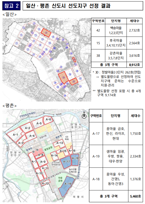 - 일산: 백송마을, 후곡마을, 강촌마을 등 3개 구역, 총 8,912호