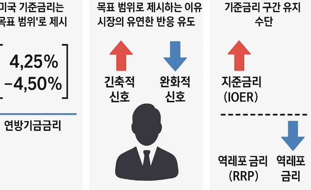 미국 기준금리가 “4.25%~4.50%”처럼 구간 형태로 표시되는 이유는, 미국의 통화정책 방식이 ‘목표 범위 제시(Target Range)’ 방식이기 때문입니다.