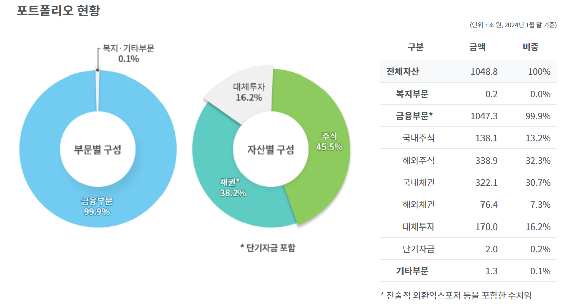 * 아래의 국민연금 포트폴리오를 보면 채권비중이 38% 수준인 것을 볼 수 있습니다.