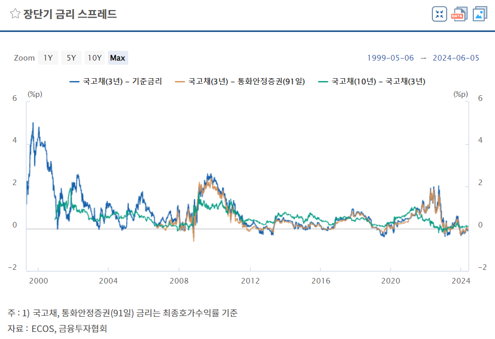 한편, 한국의 장단기 금리차는 아래와 같습니다.