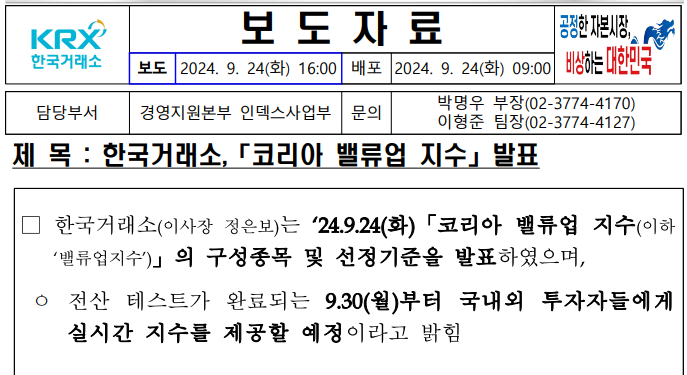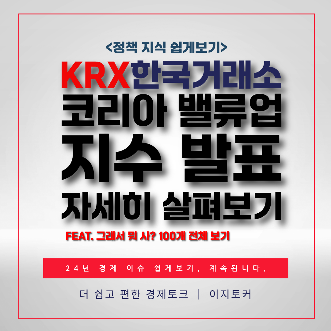 한국거래소는 2024년 9월 24일, '코리아 밸류업 지수(Korea Value-up Index)'를 발표했습니다. 이 지수는 한국 기업 중 주주환원율, 자본효율성(ROE), PBR(주가순자산비율) 등 다양한 질적 지표를 충족하는 상장기업 100개로 구성되었습니다. 이는 정부의 기업 가치 제고 지원 방안의 일환으로 개발되었으며, 투자 유도를 목표로 하고 있습니다.