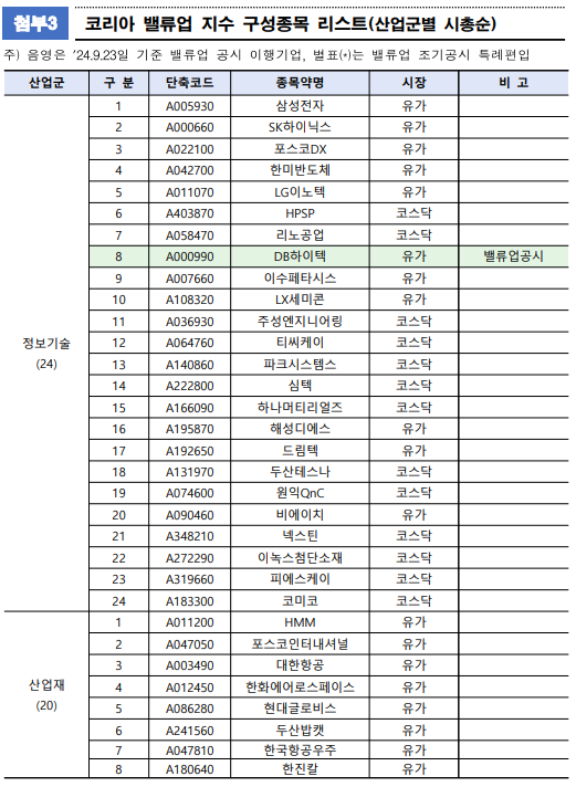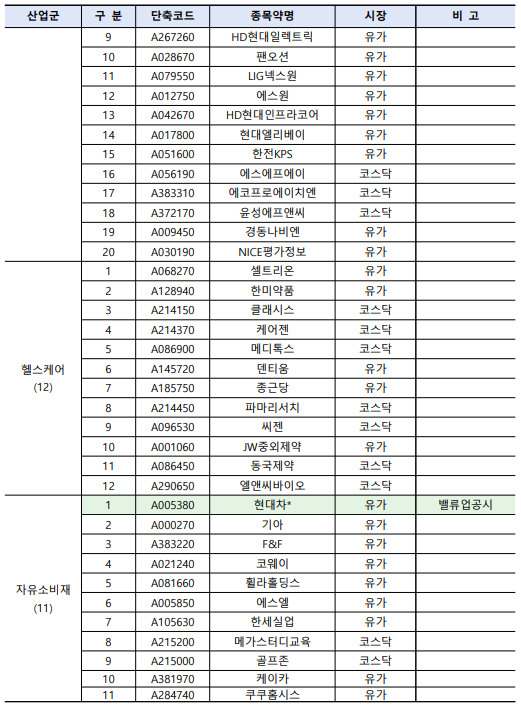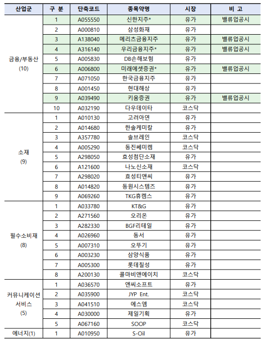 주요 금융 섹터에서는 신한지주, 우리금융지주, 메리츠금융지주 등 10개의 금융 및 부동산 종목이 포함되었습니다. 그러나 KB금융과 하나금융지주 등 일부 은행주는 포함되지 않았으며, 이는 시장 평가 기준인 PBR 요건을 충족하지 못한 것이 주요 원인으로 지적되었습니다.