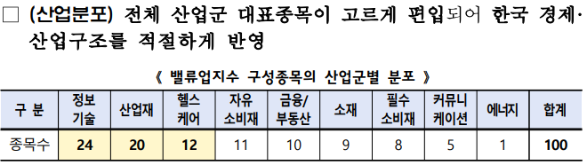 밸류업 지수는 다양한 산업군에 걸쳐 고르게 분포되어 있습니다. 정보기술(IT) 섹터가 24종목으로 가장 많았고, 산업재 20종목, 헬스케어 12종목, 자유소비재 11종목 등이 포함되었습니다. 유가증권 시장에서는 67개 종목, 코스닥 시장에서는 33개 종목이 선정되었습니다.