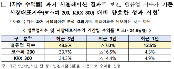 밸류업 지수는 코스피 200, KRX 300과 비교했을 때 성과가 양호한 것으로 분석되었습니다. 과거 5년 동안 밸류업 지수의 수익률은 43.5%로, 코스피 200의 33.7%와 비교해 더 높은 수익을 기록했습니다. 또한, 최근 1년간 수익률은 12.5%로, 코스피 200의 4.3%를 상회했습니다.