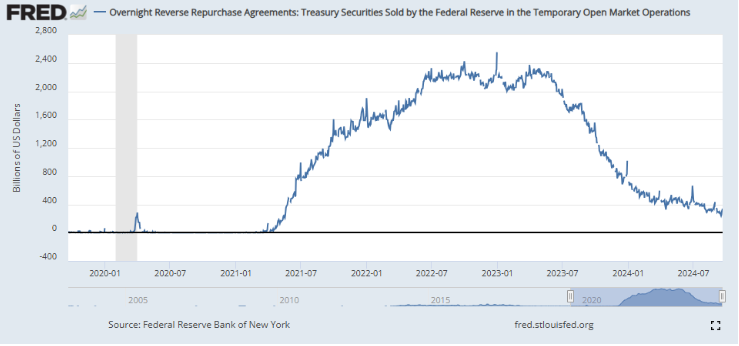 2022년 말 역레포 잔액은 2조 5천억 달러를 넘어서며 역대 최대치를 기록했지만, 이후 양적 긴축(QT, Quantitative Tightening) 정책에 따라 꾸준히 감소세를 보이고 있습니다. 그래프는 이를 시각적으로 잘 보여주며, 역레포 잔액이 2023년 이후 급격히 줄어드는 추이를 나타냅니다.