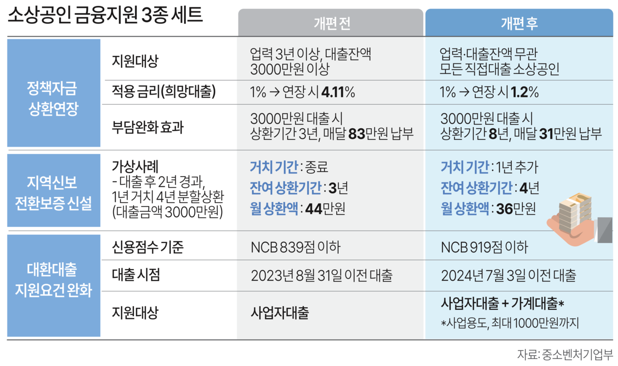 3000만 원을 대출한 소상공인이 상환기간 연장을 통해 월 납부액을 83만 원에서 31만 원으로 줄일 수 있습니다.
