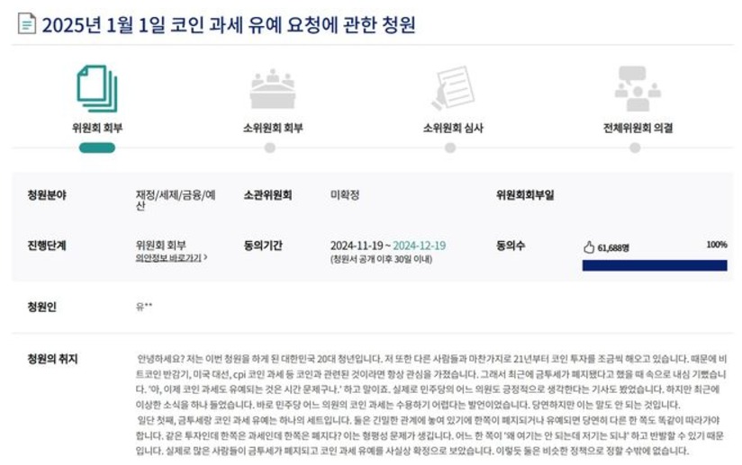 국회 전자 청원에는 "가상자산 과세 유예"를 요구하는 청원이 올라와 단 이틀 만에 6만 명의 동의를 얻었습니다. 이 청원은 상임위 심의 대상에 오르게 됩니다.